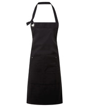 A welcome addition to the existing range of Calibre aprons, this full bib style sees a kangaroo style pocket stitched into four handy compartments. Finished with rivets for styling and a gun metal eyelet for facilitating the neckband, this apron offers a touch of luxury with the heavy cotton canvas fabric giving a soft, yet tough feel.
