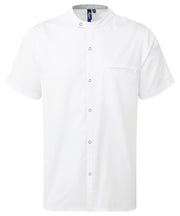 This modern banded-collar chef’s shirt combines the durability of a chef’s jacket with the lightweight nature of a shirt. It has an asymmetric mandarin collar with pop-stud fasteners down the front for easy wearing, while a contrast inner neckband helps to conceal marks from day-to-day wear. Pocket bag can be moved to allow for embroidery. Made with a combination of certified recycled polyester and cotton.